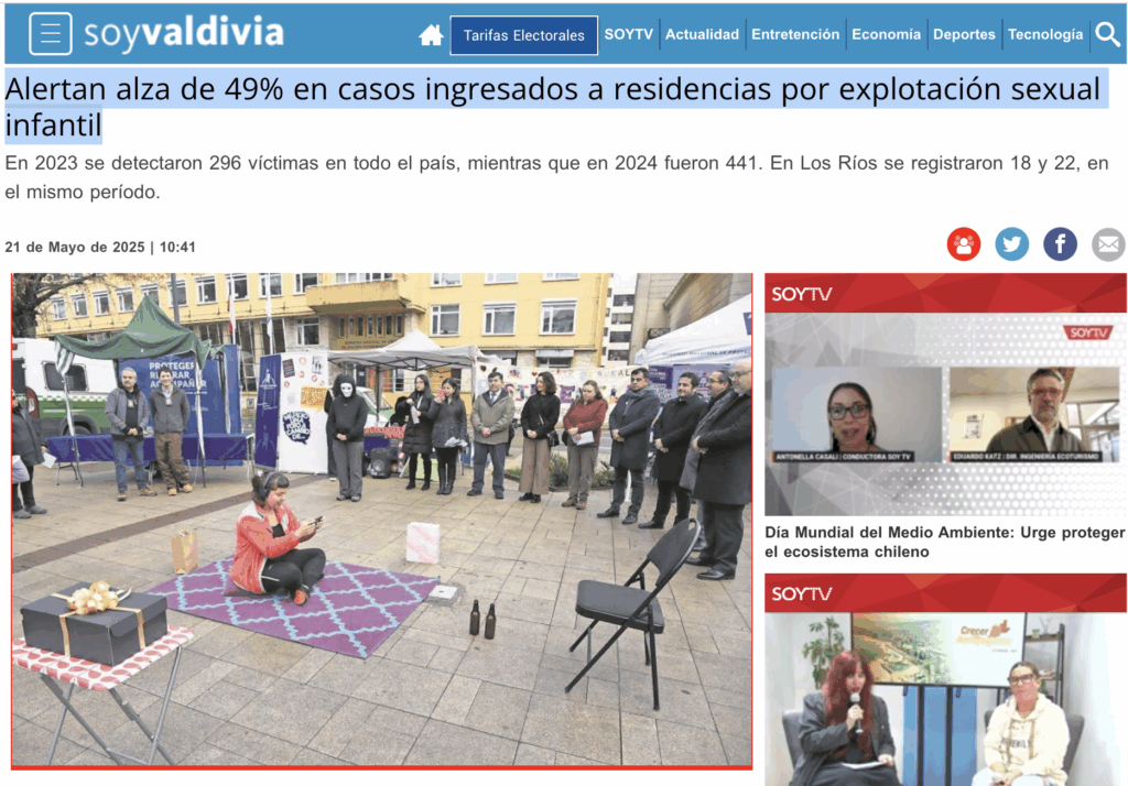 Getting your Trinity Audio player ready... Revisa la noticia completa en este enlace. / 21.05.2025 Fuente: https://www.soychile.cl/valdivia/policial/2025/05/21/906689/alza-explotacion-sexual-infantil.htmlSitio:Soychile.cl TwittearCompartir0 CompartirCategoría: Prensa5 junio, 2025Navegación entre publicacionesAnteriorPublicación anterior:Tierra de Esperanza en la PrensaSiguientePublicación siguiente:En la Prensa /Explotación sexual infantil en Chile, una realidad poco visible