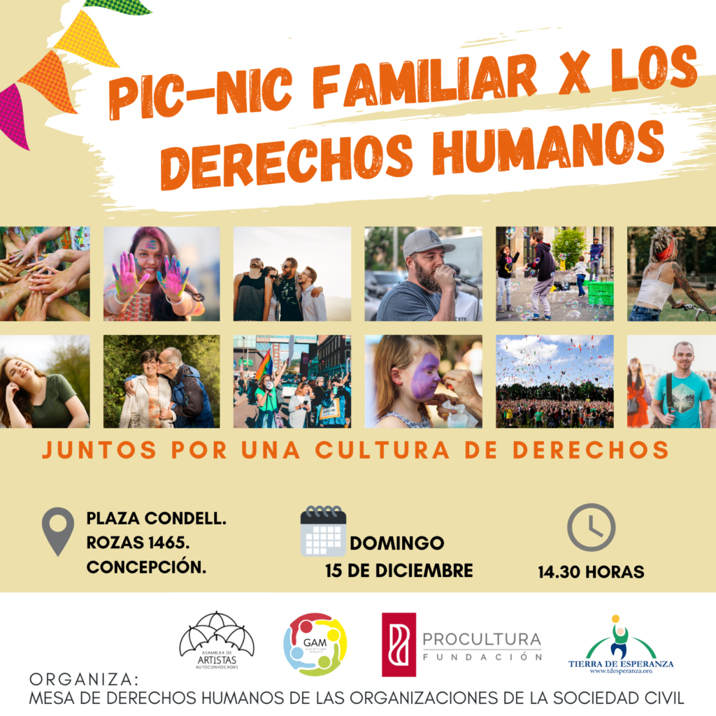 En el contexto del día internacional de los Derechos Humanos (conmemorado ayer), el próximo 15 de diciembre en la Plaza Condell de Concepción, Fundación Tierra de Esperanza participará, junto a otras organizaciones de la Sociedad Civil en la actividad familiar Pic-Nic por los Derechos Humanos. Es un espacio comunitario de diálogo y actividades, donde se entregará información en la temática, y estará acompañado por artistas locales agrupados en el Colectivo de Artistas Autoconvocados. Te invitamos a ser parte de esta actividad familiar . También puedes inscribirte para apoyar en nuestro módulo, con Johanna Sanhueza ([email protected]), coordinadora técnica, quien es la que activamente ha participado en la Mesa Derechos Humanos de las Organizaciones de la Sociedad Civil, representando a nuestra institución.
