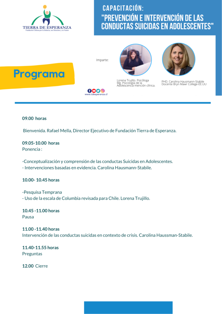 La jornada estuvo a cargo de la Carolina Hausmann-Stabille, doctora, investigadora y docente de Bryn Mawr College de Philadelphia, y de Lorena Trujillo, Magister en psicología clínica de la adolescencia y coordinadora técnica en Fundación Tierra de Esperanza. Ambas profesionales destacaron la importancia de hablar y de no estigmatizar una realidad que aún es tabú en la sociedad.