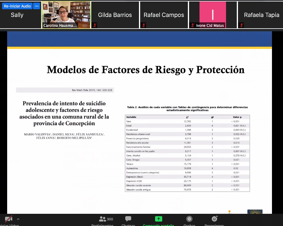 Frente a ello, el webinar también profundizó en el rol que deben tener los profesionales que trabajan directamente con población en riesgo. Lorena Trujillo Padrón, indicó que “quienes trabajamos con población infantoadolescente somos privelegiados para pesquisar tempranamente los casos. Del 70% de los problemas de la población adulta, se originaron en la etapa infantoadolescente, por lo tanto tenemos la posibilidad con una escucha activa de evaluar, pesquisar tempranamente y prevenir. Esto no está arraigado exclusivamente en el profesional psicólogo y psiquiatra , sino que como comunidad tenemos que seguir madurando nuestro rol, porque todos podemos tener un lugar en esta tarea”.