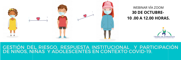 Inscríbete en este webinar gratuito que este viernes 30 de octubre se realizará desde las 10.00 a 12.00 vía Zoom, en el marco del mes que se conmemora la Reducción del Riesgo de Desastres y donde se abordará el enfoque de la participación de los niños, niñas y adolescentes en el contexto de pandemia por Covid -19.