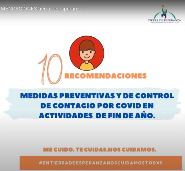 Fundación Tierra de Esperanza durante el año 2020, a partir de marzo, inició diversas acciones para el cuidado de sus colaboradores y los niños, niñas y adolescentes, que a diario participan en los distintos programas desde Iquique a Puerto Montt. Claudio Guerrero, coordinador de la Unidad de Gestión de Riesgos de la institución, señaló que estas recomendaciones se suman a un trabajo preventivo y coordinado impulsado en coordinación con las distintas direcciones y explicó que «a fin de año en la mayoría de los proyectos se realizan actividades de celebración de la Navidad , actividades muy bien valoradas y que son parte de las acciones que refuerzan las intervenciones que realizan los equipos. Sin embargo, en el contexto de la pandemia , la realización de estas actividades requieren garantizar la seguridad sanitaria para todos/as los/las participantes».
