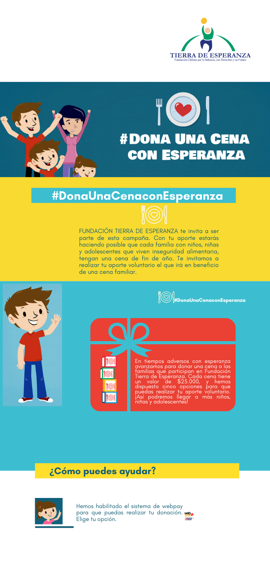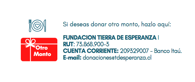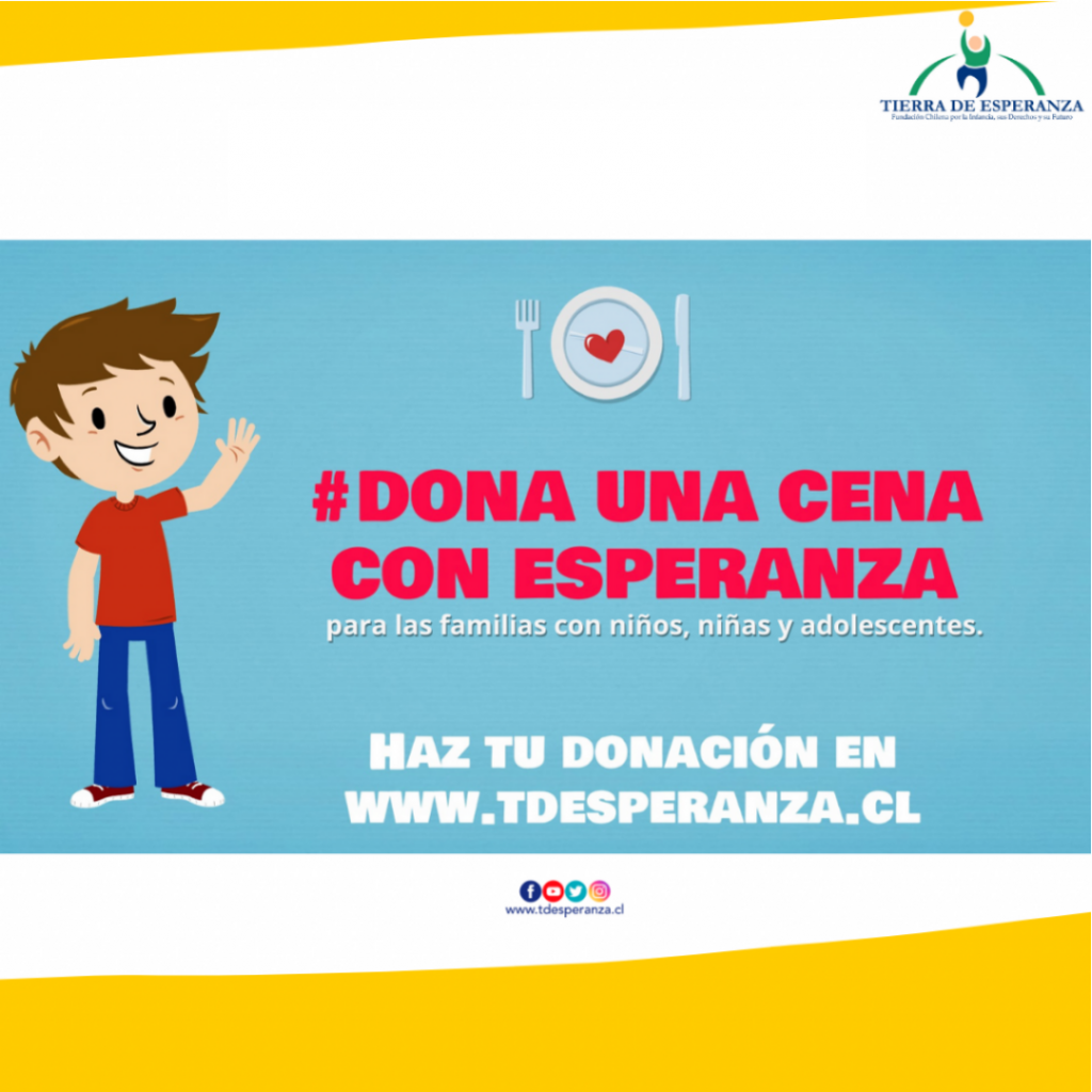 Nacional. Por segundo año consecutivo Fundación Tierra de Esperanza inició su colecta virtual a través de la campaña #Dona una Cena con Esperanza, la que estará abierta a donaciones desde el 2 de agosto al 14 de diciembre en el sitio web tdesperanza.cl . El objetivo de esta causa solidaria es beneficiar con una cena de fin de año a los niños, niñas y adolescentes en situación de vulnerabilidad, y que participan en los programas que Fundación Tierra de Esperanza tiene desde Iquique a Puerto Montt.