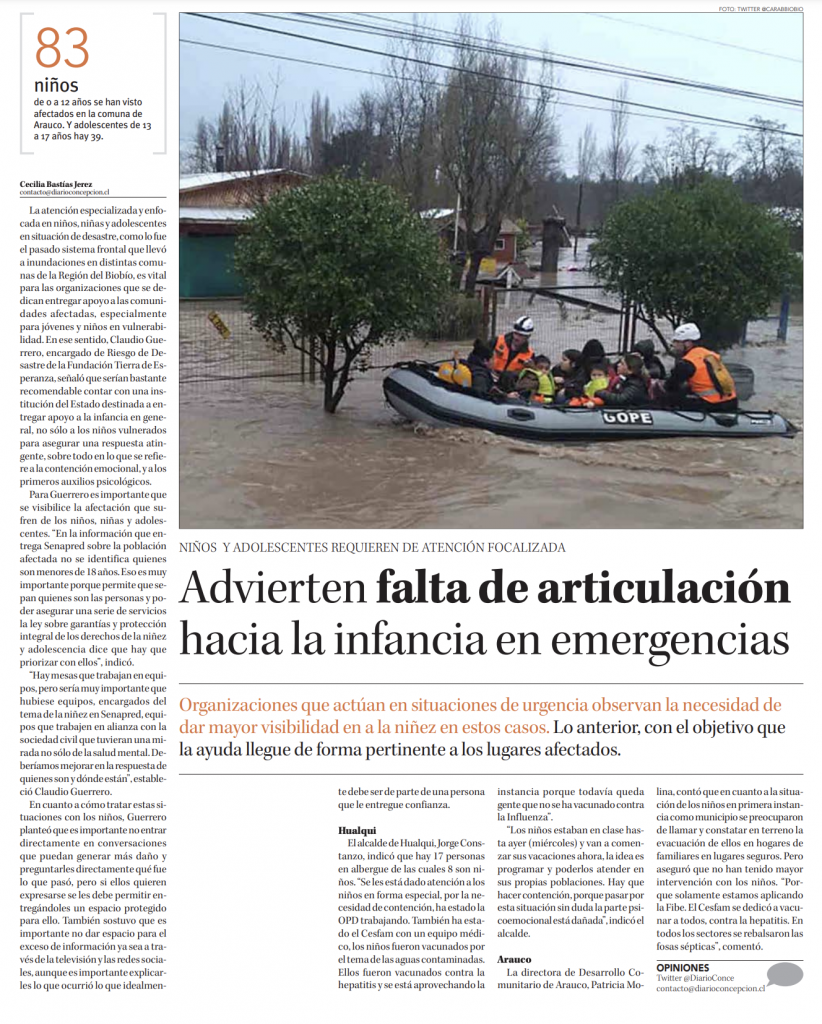 Agradecemos la noticia publicada por el Diario Concepción que permitió a Fundación Tierra de Esperanza hacer visible la importancia de considerar a la niñez en la planificación en situaciones de emergencias.