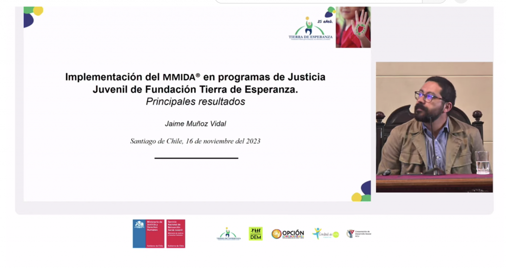 Jaime Muñoz Vidal, profesional de Fundación Tierra de Esperanza expuso sobre la Implementación del MMIDA en programas de Justicia Juvenil de Fundación Tierra de Esperanza, enfatizando que es un riguroso Modelo Muldidimensional de Intervención Diferenciada que entre otras cosas da cuenta sobre la importancia de contar con una metodología de intervención con plataformas tecnológicas robustas que faciliten y favorezcan el trabajo técnico directo, la supervisión y la gestión de equipos de trabajo. Fundación Tierra de Esperanza está certificada en el el modelo MMIDA, que cuenta con el desarrollo científico del equipo de la Universidad de La Frontera, y es un aporte a las transformaciones del sistema de justicia juvenil chileno.