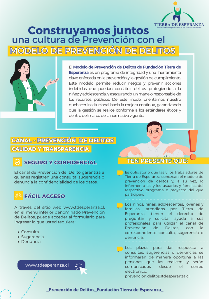 En su compromiso con la protección de la niñez y adolescencia, así como con el bienestar de sus equipos de trabajo y la transparencia en el uso de los recursos, Fundación Tierra de Esperanza continúa reforzando la promoción de un modelo de prevención de delitos como parte de su gestión.